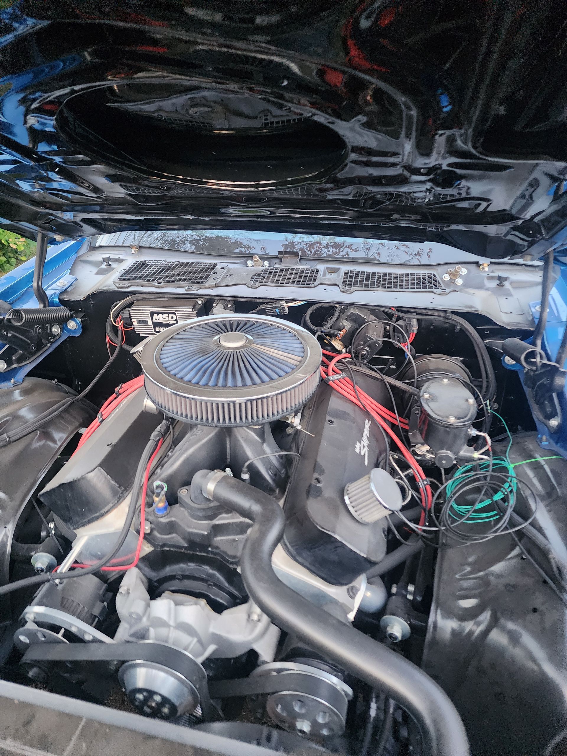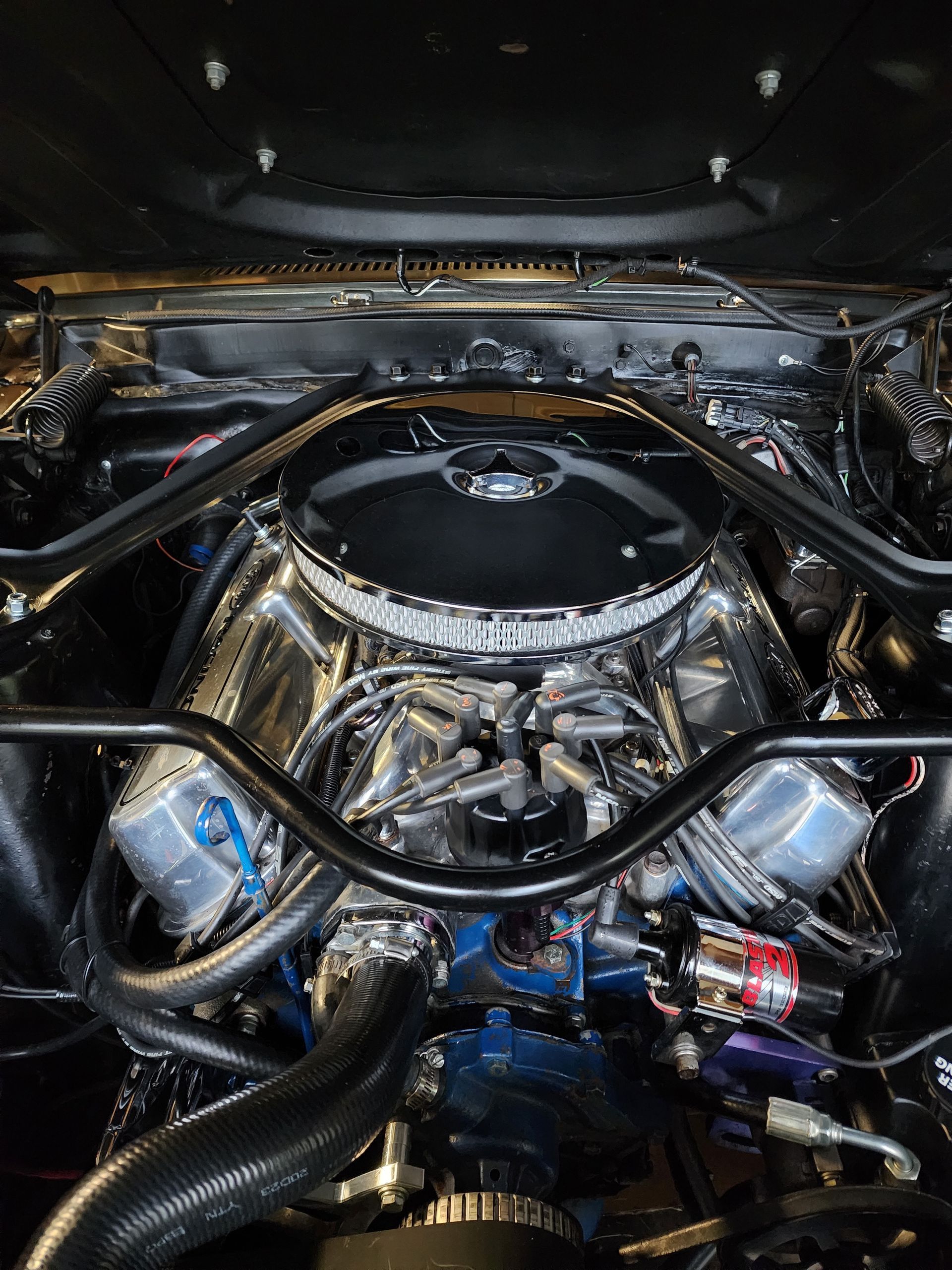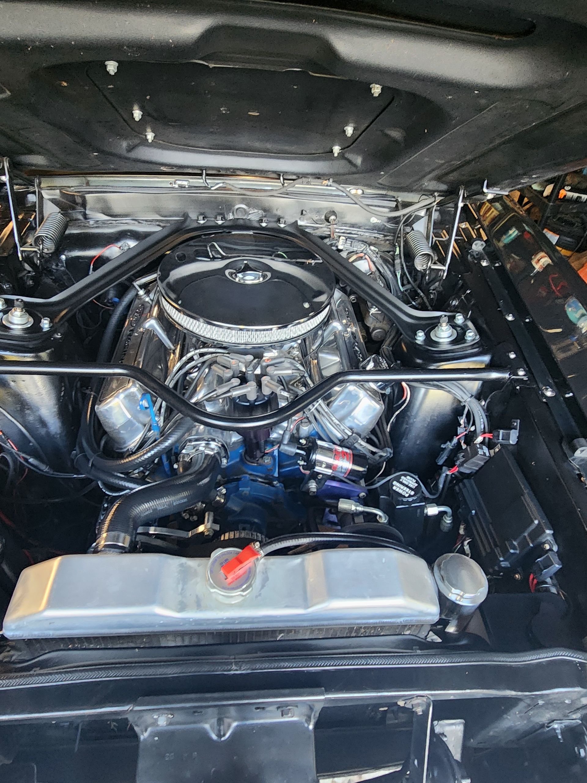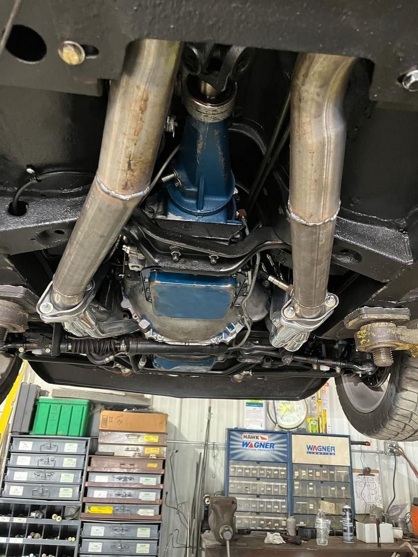 - FPA custom long tube headers, power steering, aluminum radiator, is electric cooling fan, built C4 transmission with aluminum cervo and deep pan, 3 speed auto